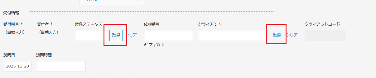 ステータスやクライアントの情報を設定する為には、「取得」をクリックして、ポップした画面から選択してください。