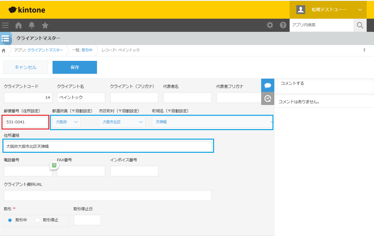 クライアントマスターの新規登録だけではありませんが、住所を登録する前に〒番号を先に登録してください。登録を終えて、カーソルが移動しますと都道府県~受有所連結までが、自動的に住所が設定されます。住所連結の「大阪府大阪市北区天神橋」あとに丁番を手入力してください。「大阪府大阪市北区天神橋7-10-4 Creta 4F」