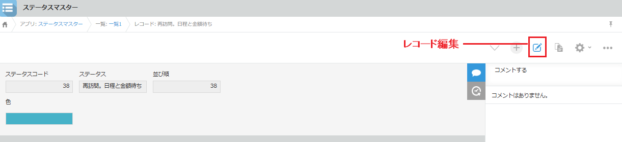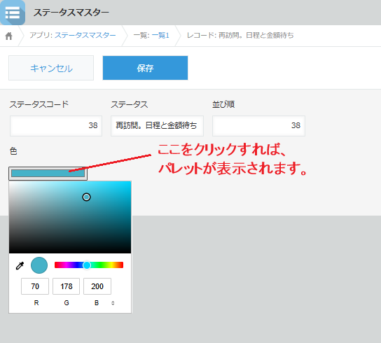 5-1.ステータスマスター 公開日:2025年11月28日 ステータスマスターは、管理者以外は、設定を変更しないください。 編集するためには、レコード編集をクリックしてください。 ↓ ↓ ↓ パレットでステータスの色を変える事ができます。